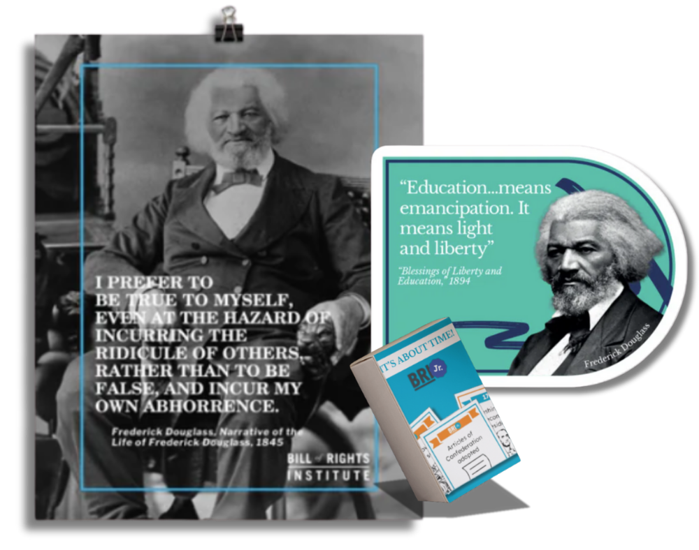 Observe Black History Month using our Frederick Douglass BRI Jr. Bundle which features a 3"x3" sticker and a 8"x10" poster combo with quotes from Frederick Douglass and our It's About Time elementary timeline card game that focuses on key dates in American history between 1020 and 2008.